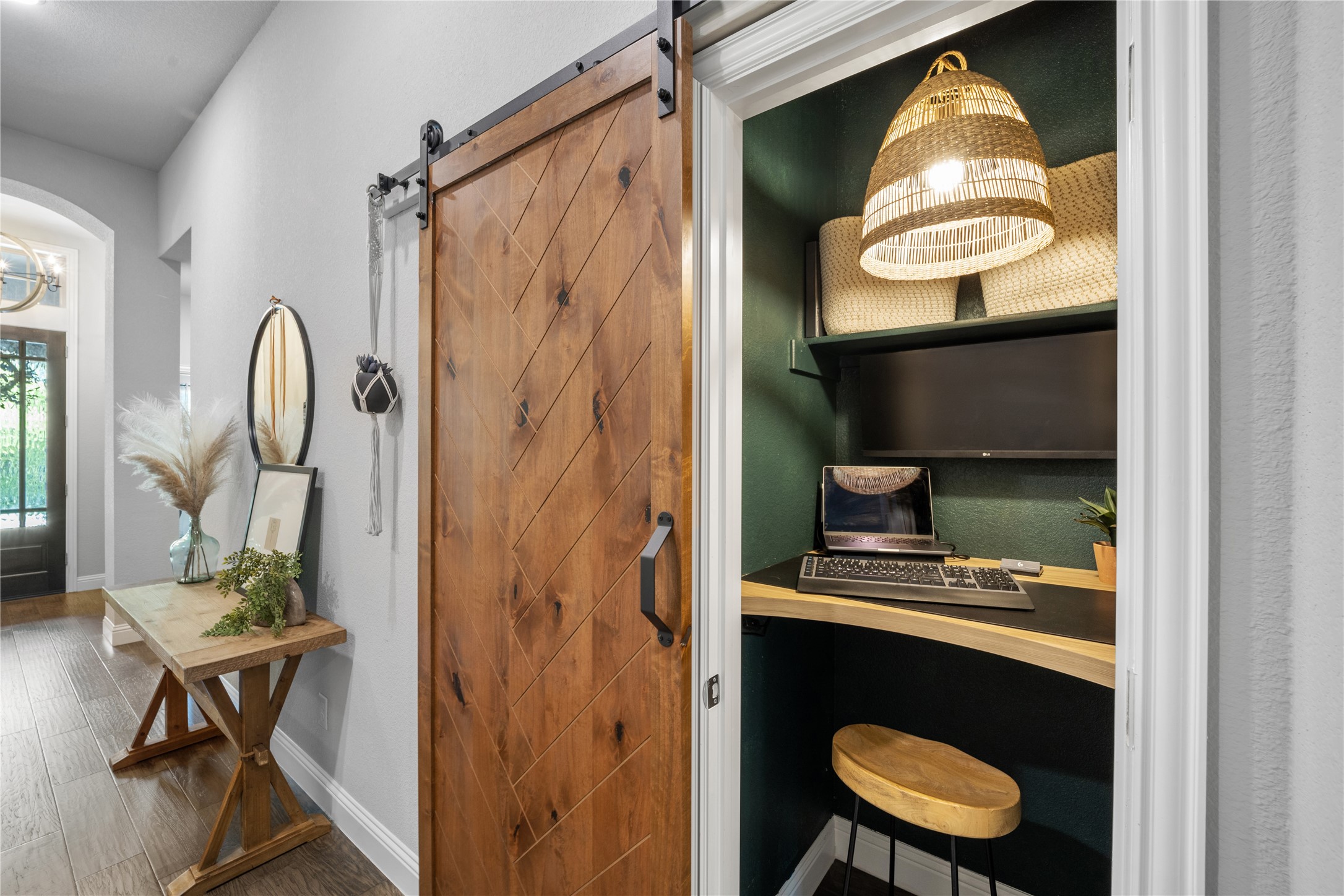 Wow!! Located in sought-after Trinity Falls. Over 1700 sqft of pure delight. You will feel as though you've walked into a model home. The open living room with open concept kitchen, over-sized island that is made for entertaining. Private owner's suite complete with spa bath. This home is about creative spaces - a hidden bar and private desk area complete with barn door. Don't miss the cozy backyard with extended deck and covered patio. This is a must see!