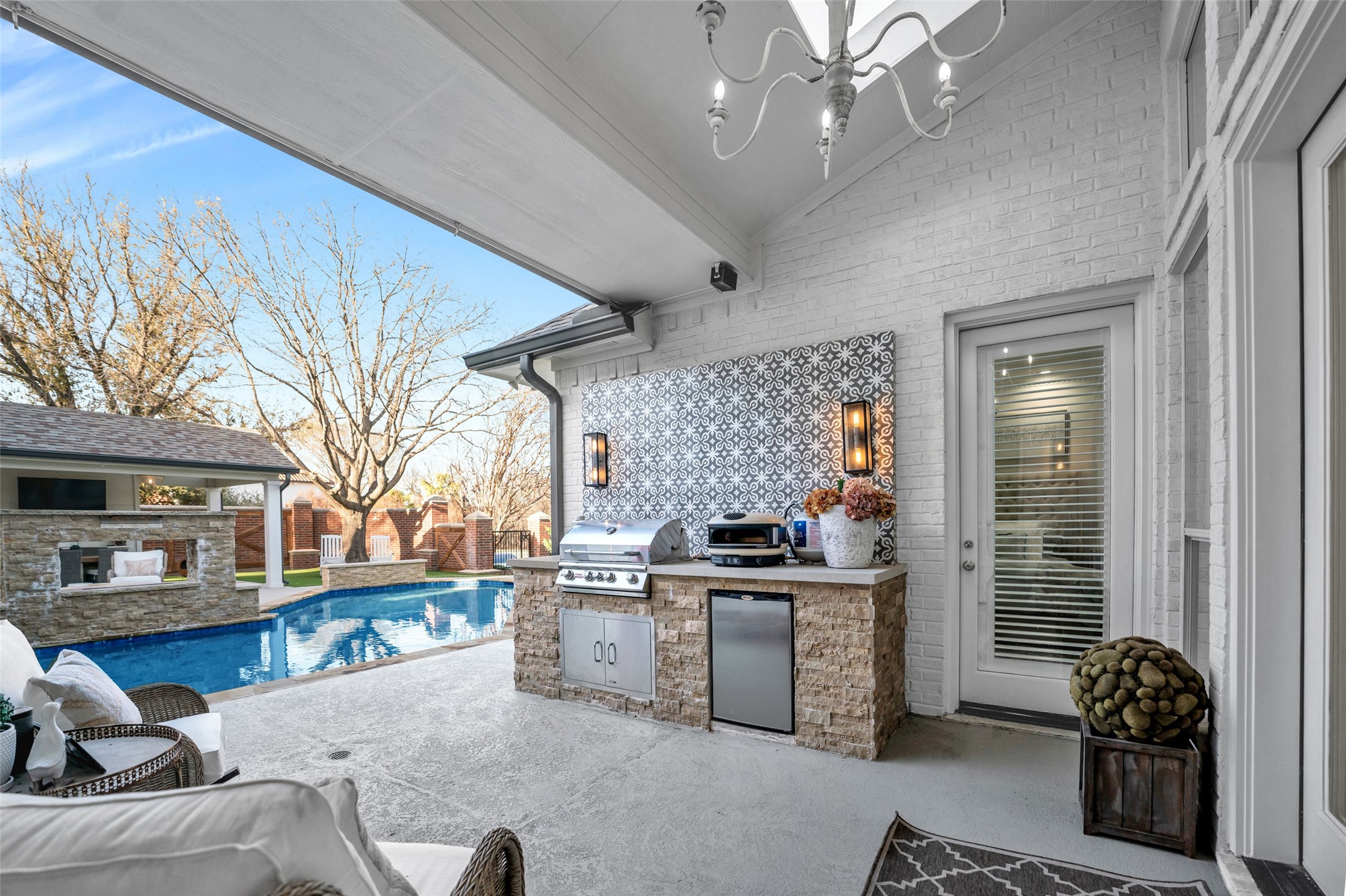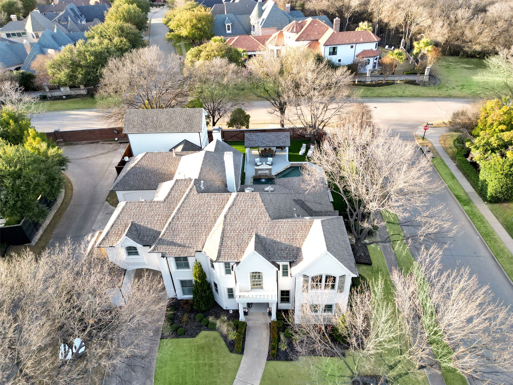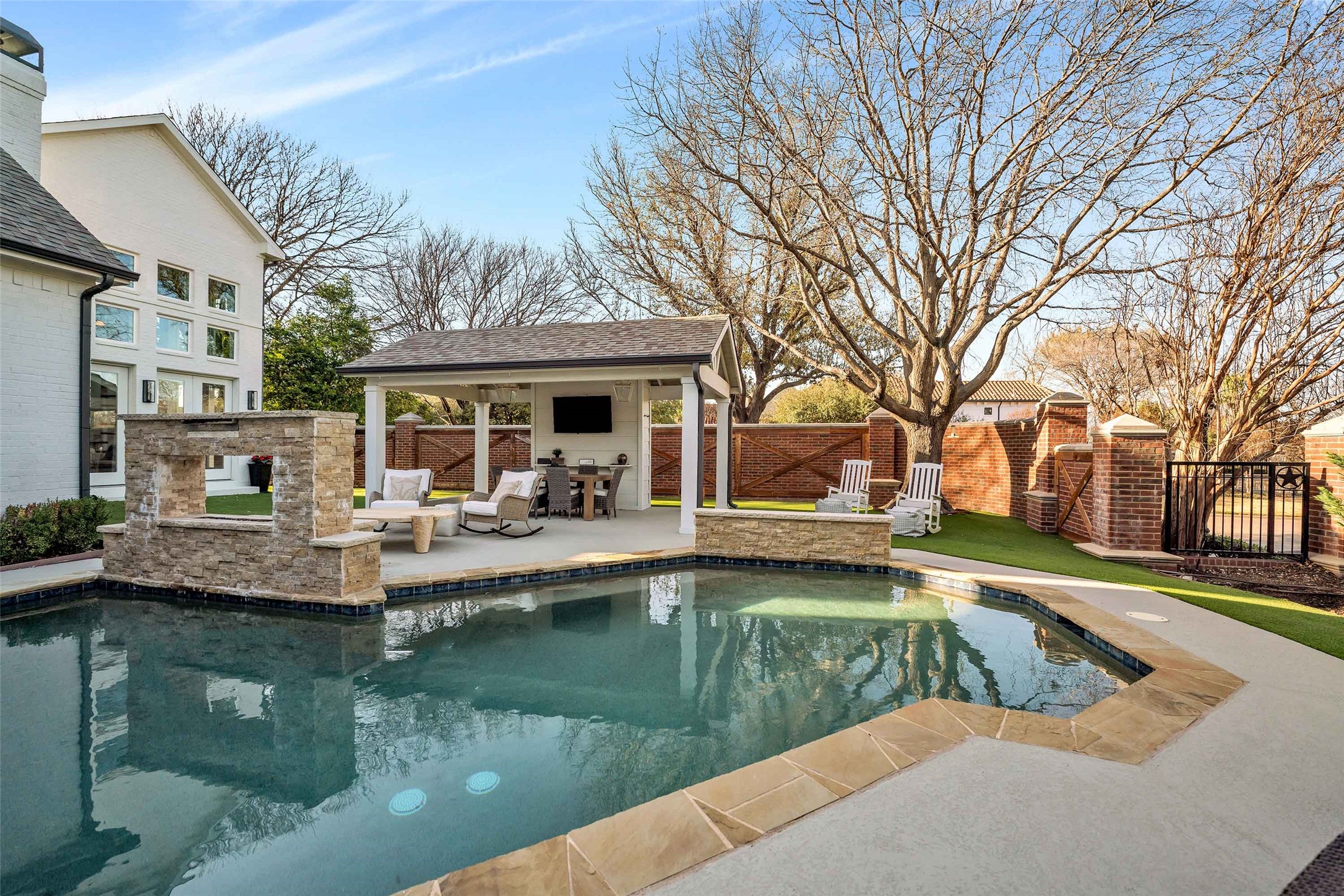 Located in the prestigious gated community of Starwood, this fully remodeled home sits on a beautifully treed .30-acre corner lot with exceptional curb appeal. Spanning over 5,200 square feet, the residence showcases new wide-plank hardwood floors, accent beams, trending paint, and updated lighting throughout. The stunning chef's kitchen features quartz countertops, ceiling-height cabinetry, and a well-appointed butler's pantry with wine and coffee bar, dual beverage refrigerators, and ice maker -- ideal for everyday living and entertaining. The private owner's suite offers serene pool views, direct backyard access, and a spa-inspired bath with freestanding tub and frameless shower. Upstairs, you'll find spacious secondary bedrooms and a game room with convenient back staircase access. Don't miss the spectacular two-story entertainment addition complete with first level media room, sunroom, loft, and dry bar -- designed for unforgettable gatherings. Enjoy a resort-style backyard with sparkling pool, waterfall feature, cabana, built-in grill, turf, and mosquito misting system. Additional highlights include a three-car garage with EV outlet. Zoned to award-winning Frisco ISD and located minutes from Legacy West, The Star, PGA headquarters, and DFW Airport.
