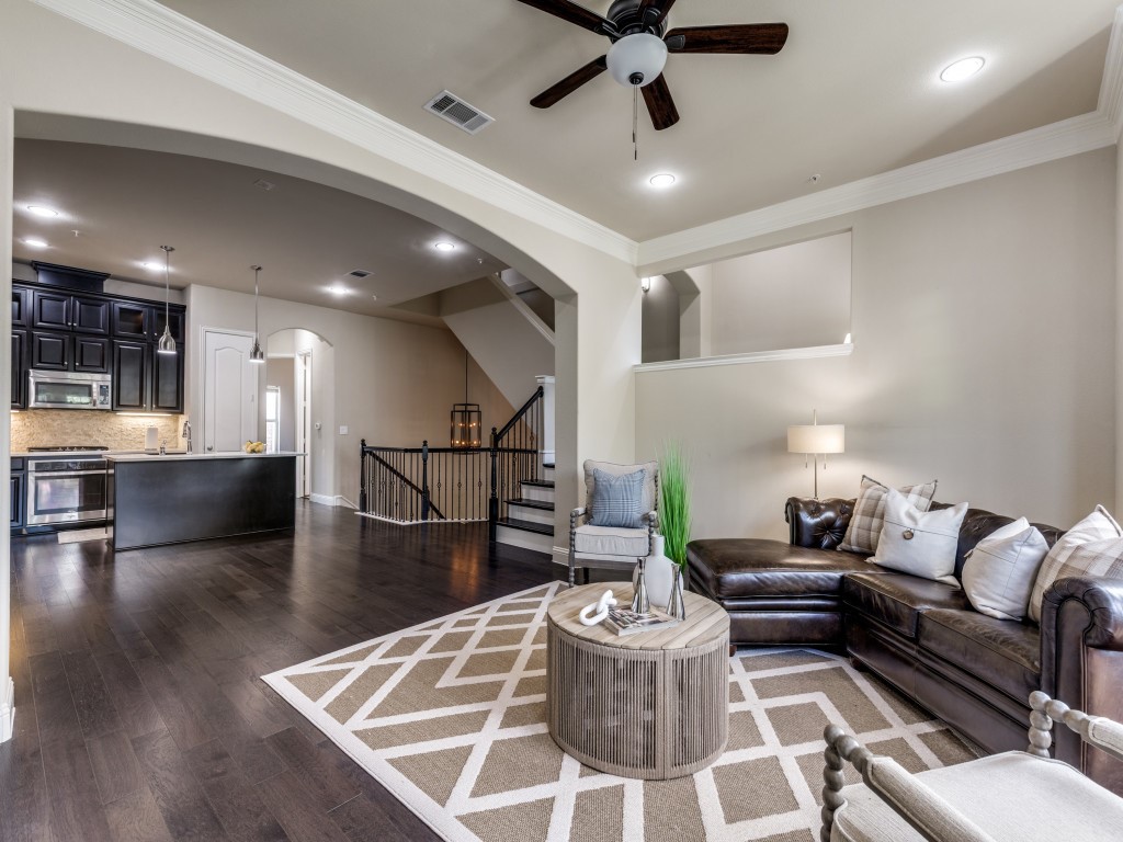 Location says it all! Enjoy upscale townhome living in the gated community of The Manors of Vista Ridge. This home checks all the boxes - open concept living spaces, 11' ceilings, beautiful hardwoods. Family room fireplace flanked with trending floating shelves. Stainless appliances, quartz counters and ceiling height cabinetry with glass uppers. Private primary suite with marble fireplace and spa bath, 17' over-sized walk-in closet and second laundry room. Versatile first floor flex room with wet bar featuring quartz counters and marble backsplash - a great entertainment space for a game or media room, second Primary Suite or Separate Living Quarters. The built-in wet-bar makes it all possible! Private patio for outdoor fun. Two secondary bedrooms with walk-in closets. 2 car garage with universal charger. Community pool. Close to Lake Lewisville and miles of hike and bike trails. Lewisville ISD. Unmatched location at Hwy 121 and I35 for restaurants, shopping and entertaining. Minutes from DFW.