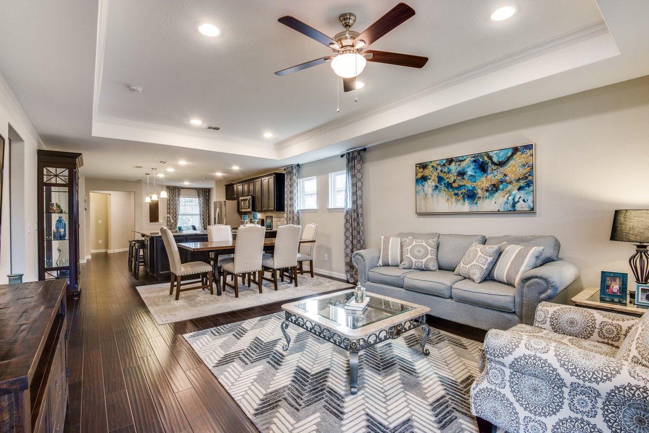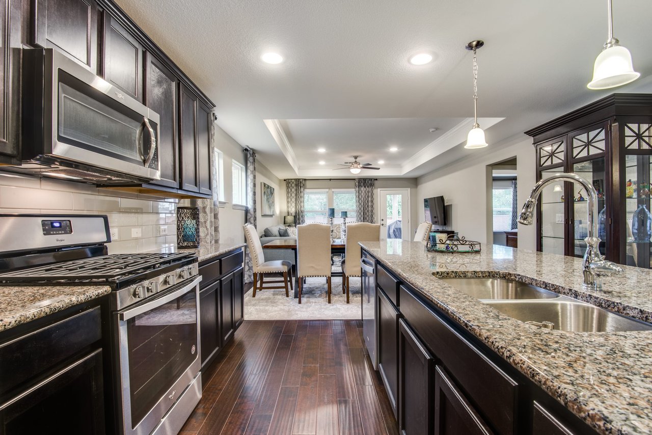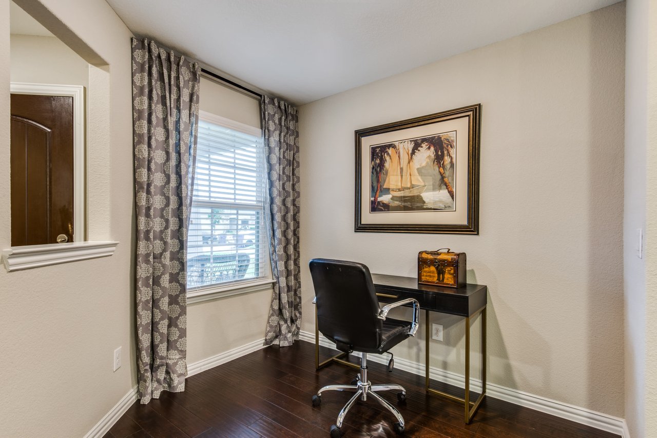 Meticulously maintained. This villa offers modern details, wide plank wood floors and a covered patio with grassy area. The family room is a wonderful space for entertaining. The cook’s kitchen is open for gatherings and offers a large island with granite counters, tons of storage and gas range. A flex space is perfect for desk or sitting area. The spacious private owner’s suite opens to bath with dual sinks, shower, and large walk-in closet. The guest bed is private and offers a full bath. Partially fenced yard! Enjoy all the amenities that Del Webb has to offer! Golf, workout, pools and much more. Convenient to shopping. A must see.